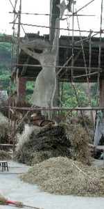Das war sehr schön und entspannend. Dann sind wir noch etwas durchs Grün gegangen. Es gab viele Obstbäume, Pfirsiche und anderes Obst, das ich nicht kenne, aber sehr gut ist. Die Chinesen klauen da aber nichts. – Ein paar Umwege mussten wir machen, weil mein Kollege Angst vor Hunden hat. Wir kamen dann auch an einem Bauernhof mit einem freischaffenden Bildhauer vorbei. Das war überraschend. Im Vorbeigehen habe ich ein paar Statuen gesehen,